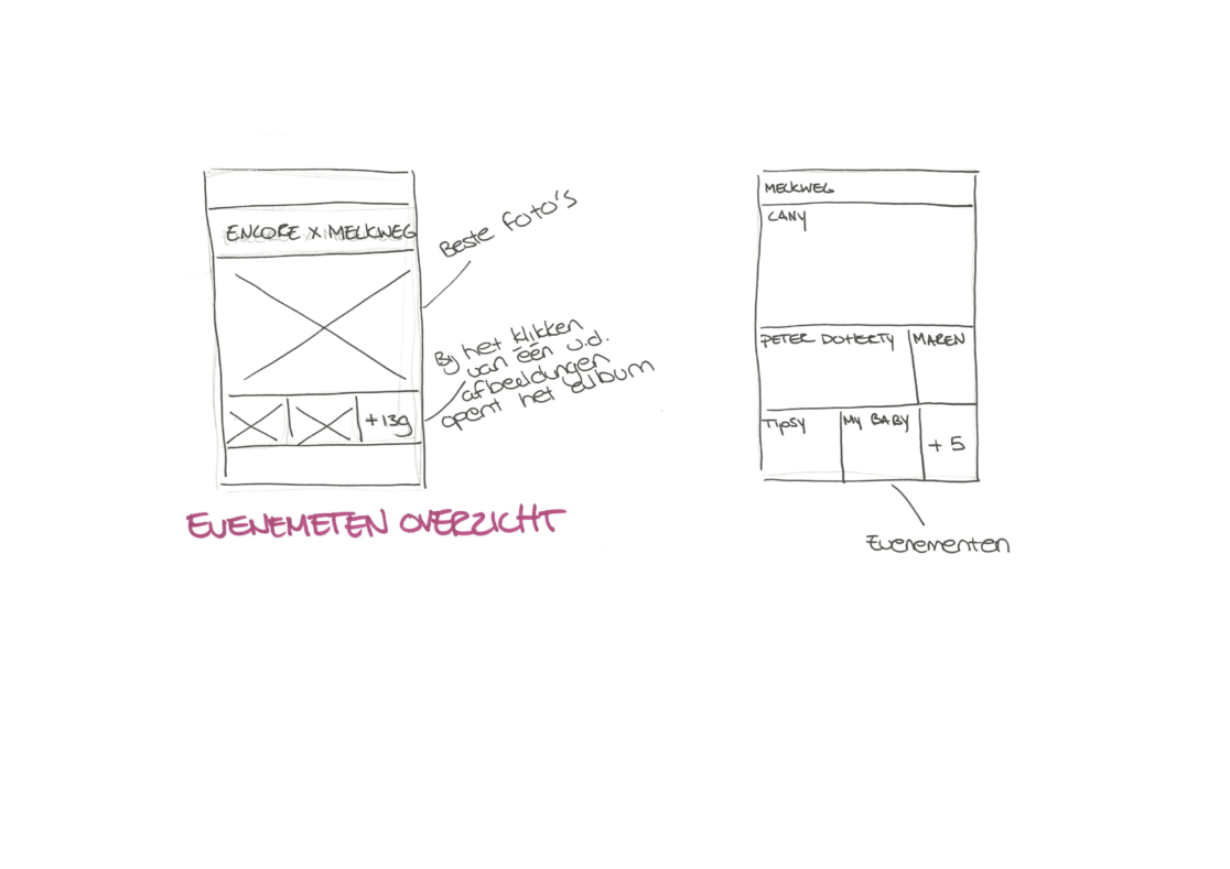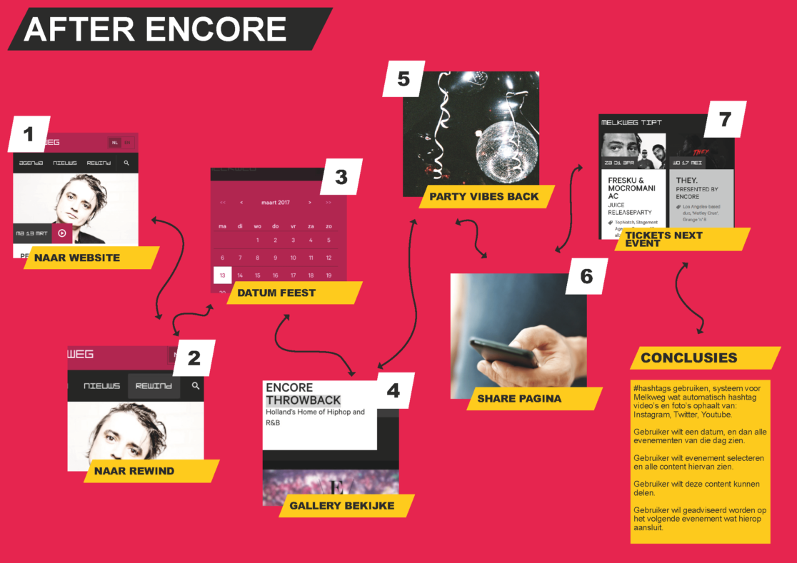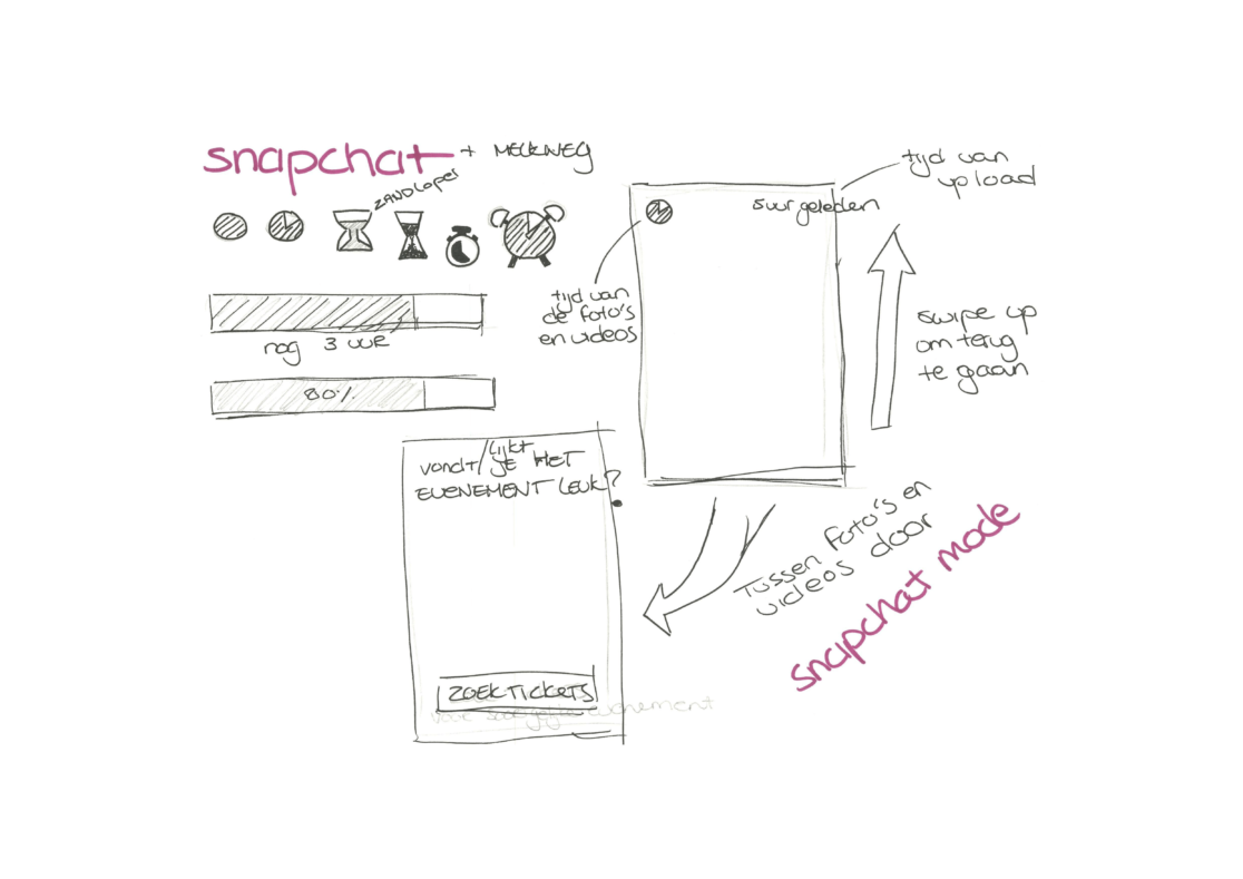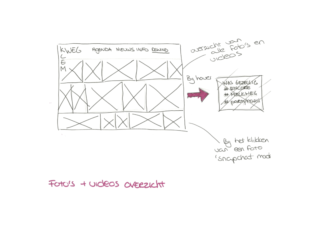Ons concept is dat de video’s en foto’s, die op het evenement zijn gemaakt gedurende 48 uur terug te zien zijn. Dit triggert de gebruiker om binnen 48uur nog op deze pagina te kijken omdat het anders weg is. Hierdoor wordt het ook eerder gedeeld. Dit scheelt ook ruimte op de hosting van de Melkweg omdat de content maar 48uur “bestaat”