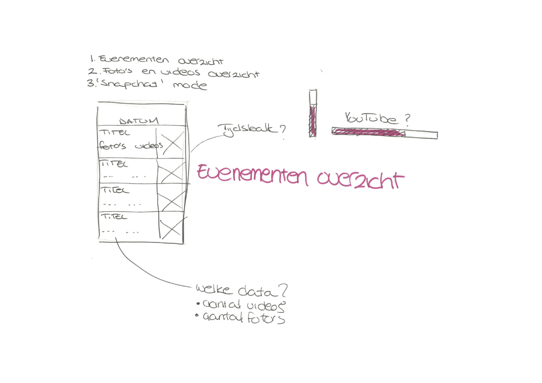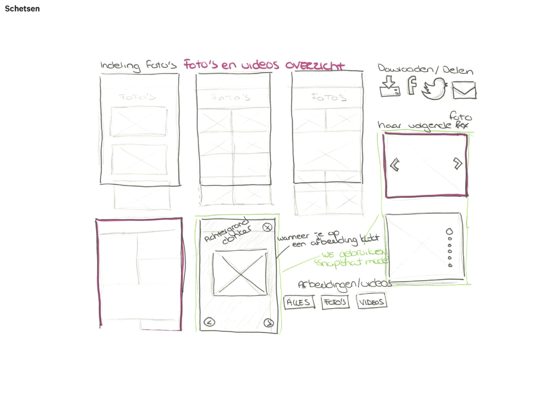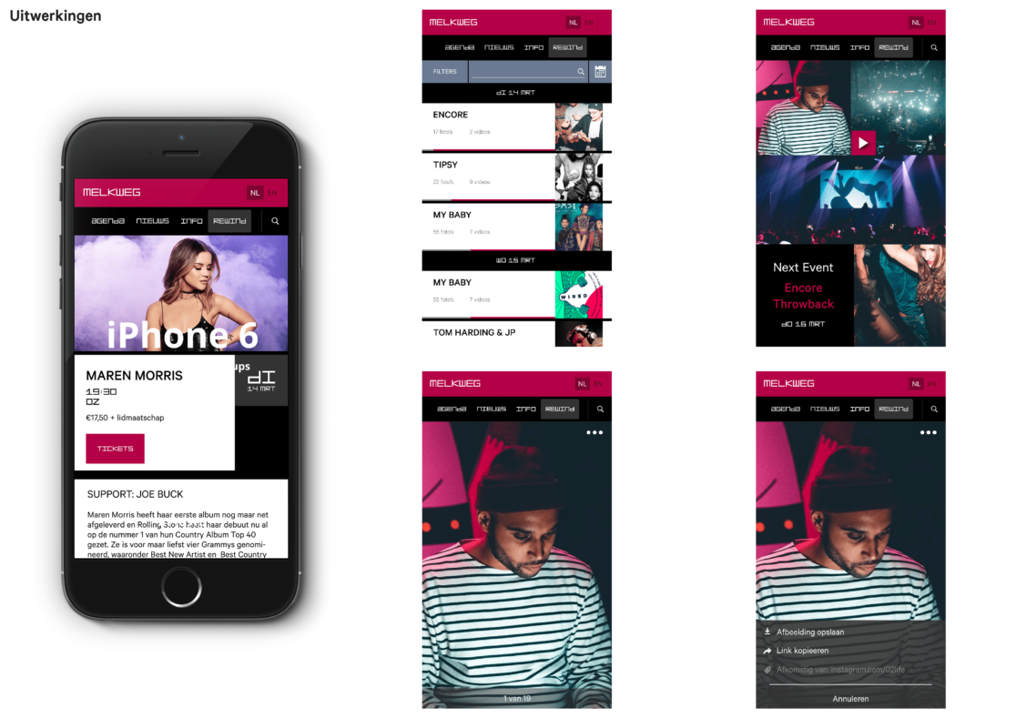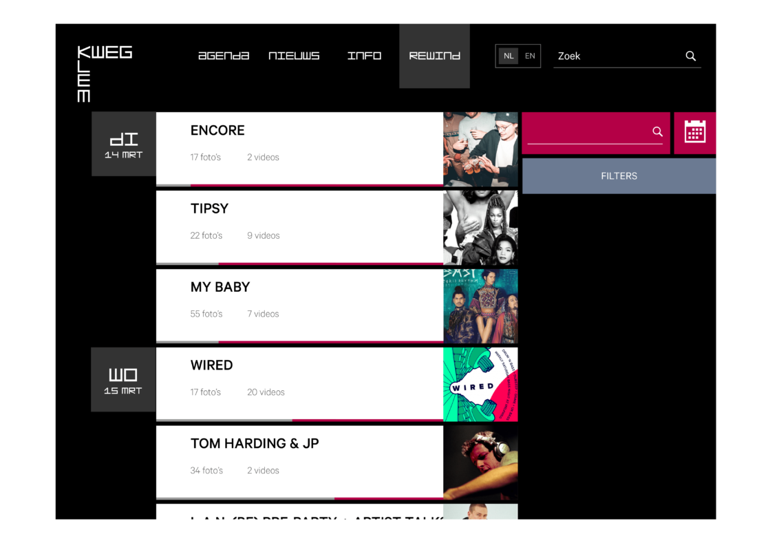 Ons concept is dat de video’s en foto’s, die op het evenement zijn gemaakt gedurende 48 uur terug te zien zijn. Dit triggert de gebruiker om binnen 48uur nog op deze pagina te kijken omdat het anders weg is. Hierdoor wordt het ook eerder gedeeld. Dit scheelt ook ruimte op de hosting van de Melkweg omdat de content maar 48uur “bestaat”